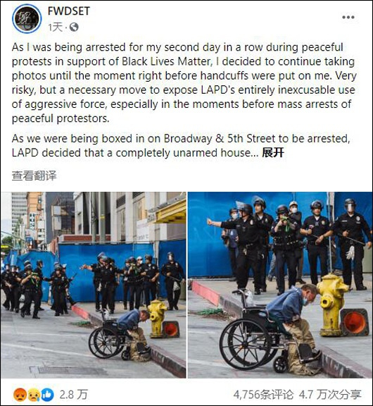 该摄影师表示,其已经因为参加和平抗议活动连续被捕两次,但他将继续进行拍摄工作,直到再次被捕。他称,洛杉矶警察局使用攻击性武力大规模逮捕和平抗议者。