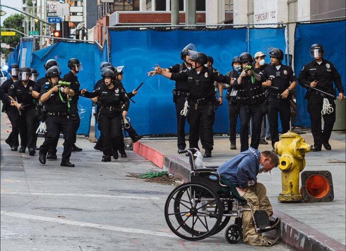 诉讼方的民权律师卡罗尔·索贝尔表示,在洛杉矶市中心的抗议活动中,至少有三名坐在轮椅上的流浪汉被洛杉矶警察发射的橡皮子弹击中。该诉讼称,其中一名流浪汉还曾恳求警方不要对他使用武力,之后他被击中面部。