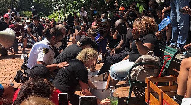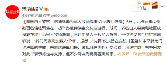 6日,北卡罗来纳州数百名信徒聚集在一起举办反种族主义抗议游行。期间,多名白人警察和社区成员跪在地上为黑人牧师洗脚,同时更多人一起加入祈祷。一位抗议者手持扩音喇叭说,“我们代表高加索人忏悔”。据悉,“洗脚”仪式旨在实践《圣经》中耶稣为门徒洗脚的典故,来表达谦卑和爱。该视频在国外社交网络上迅速扩散,有些网友对此举表示肯定与支持,但不少网友则觉得匪夷所思。