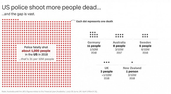 CNN数据显示,按人均计算,美国在警方拘留期间死亡的人数是英国的6倍,2018年美国警方枪杀约1000人,而德国和澳大利亚的同一数据分别只有11人和8人。
