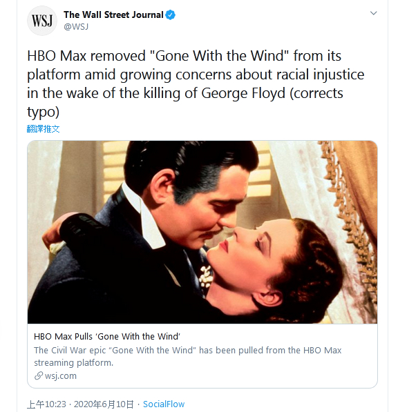 [环球网报道 记者 李东尧]全美反种族主义抗议活动持续,现在,美国南北战争时期题材电影《乱世佳人》也不能看了?美国《华尔街日报》9日报道称,目前黑人男子乔治·弗洛伊德之死引发的人们对种族不公担忧正日益加剧,华纳传媒旗下的HBO MAX平台已将影片《乱世佳人》下架。