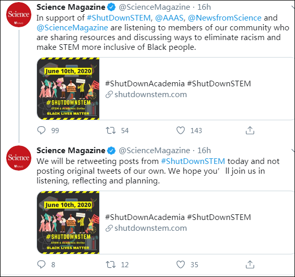 美国科学促进会出版的《科学》杂志也响应罢工,称要倾听组织成员的分享,讨论消除种族主义的方法,让STEM对黑人更加包容。该组织还邀请了12万名成员参与这项工作。