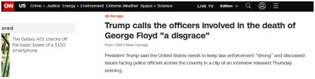[环球网报道 记者 张晓雅]“恐怖的8分钟”、“耻辱”,谈及点燃全美种族主义怒火的“黑人之死”事件,美国有线电视新闻网(CNN)称,特朗普11日对乔治•弗洛伊德死亡案件的涉事警察发出这样的严厉批评。