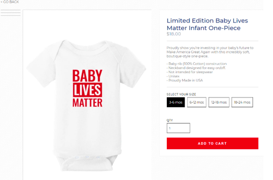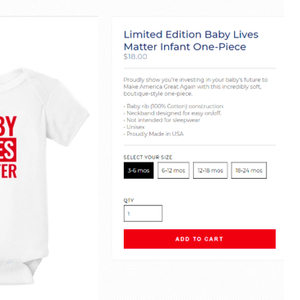 这款婴儿连体衣1月份在美国基督教保守分子组织的“为生命进军”游行中推出,目的是用于支持反堕胎运动。特朗普在那次游行中发表了演讲,成为历史上第一个在反堕胎游行中讲话的总统。
