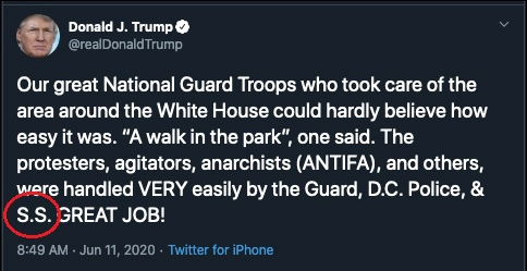 值得注意的是,近日,特朗普一则推特中出现模棱两可、引人遐想“S.S。”一词,也引发巨大争议,并一度冲上热搜。“S.S。”一词在美国网友的讨论中产生多种解读,有人结合上下文,认为特朗普是指美国特勤局(USSS),但更多人则按照字面意思,将其理解为臭名昭著的纳粹德国党卫队前身“会堂警备队”的缩写“SS”。