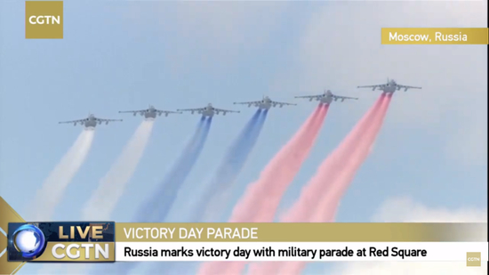 6架苏-25战机在空中拉出彩烟。/CGTN直播截图