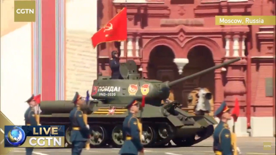 T-34坦克在装备方队中打头阵。/CGTN直播截图