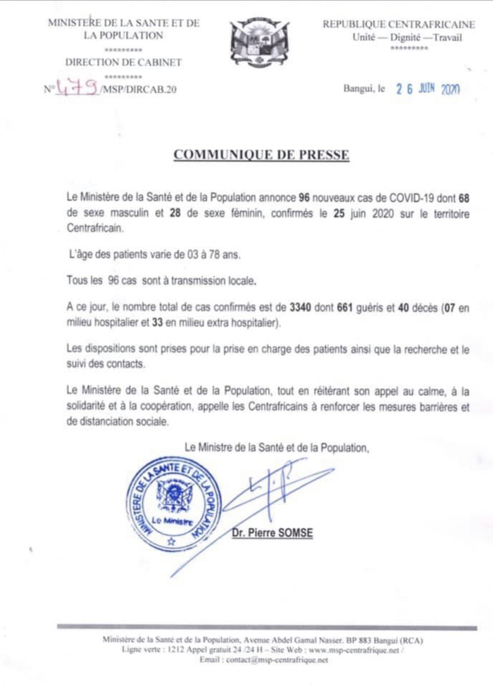 中非共和国新增96例新冠肺炎确诊病例 累计3340例