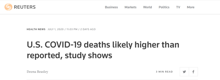 原标题:路透社:研究显示,美国新冠肺炎实际死亡人数很可能高于官方统计