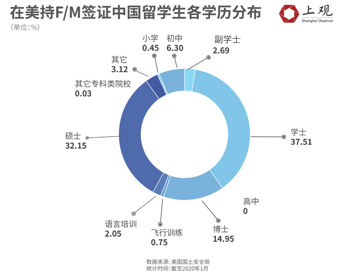 美国SEVIS系统(Student and Exchange Visitor Information System,学生和交流访问学者信息系统)显示,截至2020年1月最新数据,中国在美持F和M签证的学生人数共36。88万人,占全美留学生的32%。其中人数最多的三个学历群体是本科生、研究生和博士生,分别为138331人、118565人和55142人。