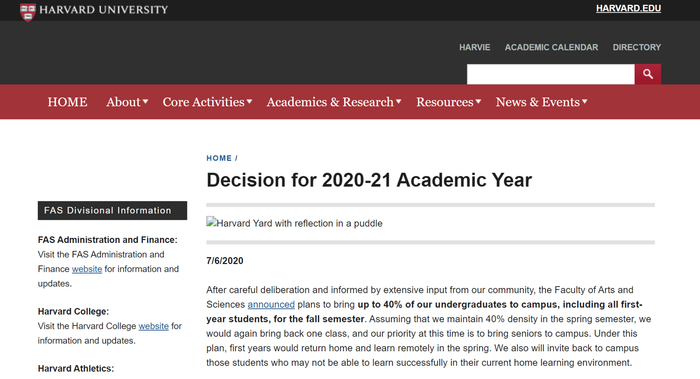 比如哈佛商学院在7月1日发表声明称,接下来的秋学期将采用线上线下混合的教学方式。但就在ICE发表新规的几个小时之前,哈佛大学的人文与科学学院在官网发表了声明,表示2020-2021学年,所有课程都将采取网上授课的形式,不管是面向校园内还是校园外的学生。并且学院为控制人流密度,只允许40%的学生返校居住。