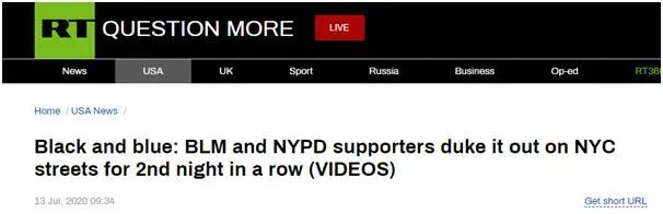 RT提到,在刚刚过去的周末中,纽约市爆发了多起暴力事件,“黑人的命也是命”示威者和警察支持者连续两天发生冲突。11日,在纽约,“黑人的命也是命”抗议者也曾与警察支持者发生冲突,双方在对峙过程中互相指责、推搡。纽约警方随后赶到,将双方分开。但当天没有人员在冲突中被捕。此外,11日在佛罗里达州的奥兰治帕克,“黑人的命也是命”示威者也曾与支持警察的示威者隔着马路对峙,不过双方并未发生冲突。