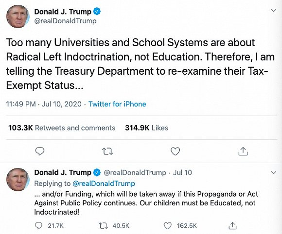 特朗普在10日发推特指责许多大学和学校系统在向学生灌输激进左翼思想,因此要求财政部重新审查他们的免税地位和受资助情况,如果继续这种违反公共政策的宣传或行动,将取消高校的优惠待遇。在他发出这条推特之前,哈佛大学和麻省理工的诉讼案举行了首场听证会。