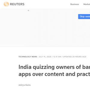 路透社:印度要求被禁中国手机应用的所有者就内容管理和业务操作回答问卷