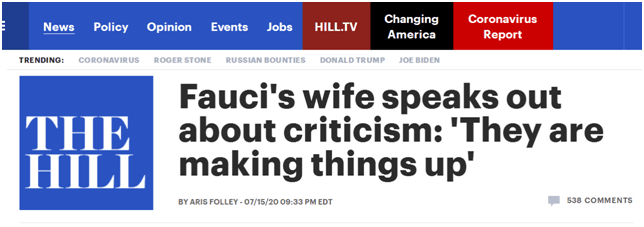 原标题:福奇妻子怒批白宫“攻击”行为:他们瞎编!