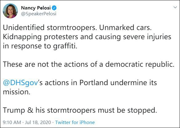18日,美国众议院议长佩洛西则发推评论称,是身份不明的人“绑架了示威者”。