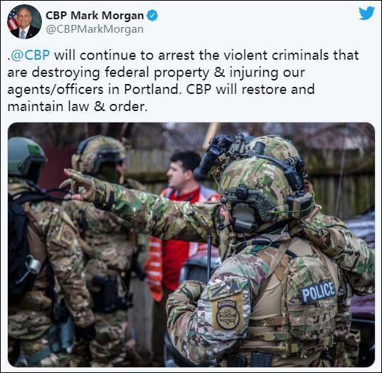 此外,美国海关和边境保护局(CBP)出来承认,他们是逮捕机构之一。但该机构局长摩根(Mark Morgan)在推特上解释说,他们的执法人员被清楚地标记为联邦官员,有独特标识符号,且他们将继续逮捕这些“犯罪分子”。美国海关和边境保护局也认为,是暴力无政府主义者在波特兰组织各种抗议活动,蓄意破坏联邦财产,并伤害联邦官员和特工。
