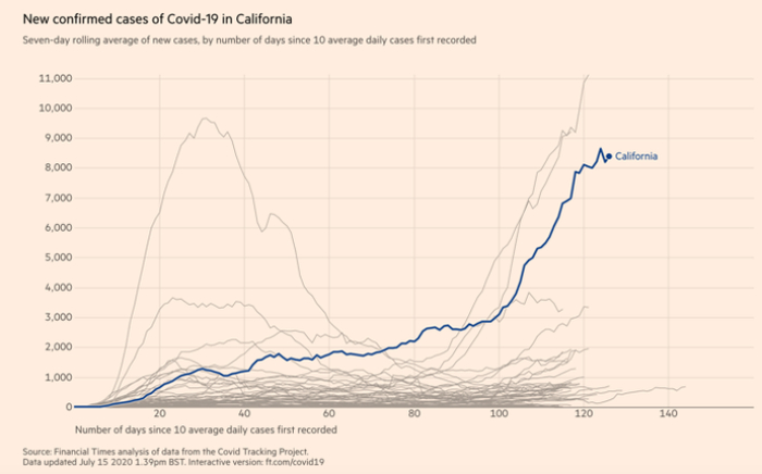 疫情发生初期,加州在全美率先颁布全州“居家令”,疫情一度得到有效控制。但在6月全面复工后,疫情出现反扑。过去一周,加州每天的新冠肺炎新增病例数都在8000例以上,几乎是一个月前的3倍,入院患者数也在过去两周增加了43%。