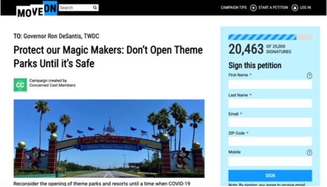 而在 “迪士尼世界”恢复营业前,有超过2万人在请愿网站上联署请愿,要求佛州政府推迟迪士尼的开业时间。