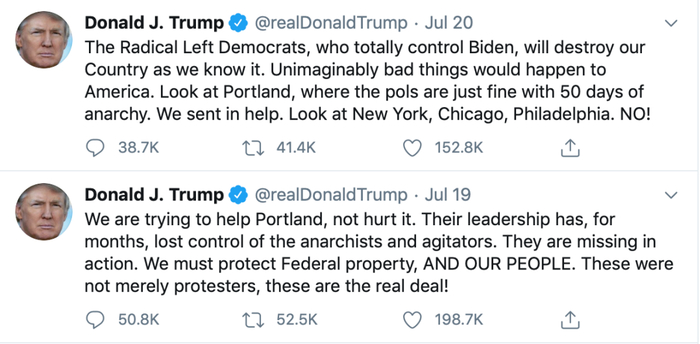 7月20日,特朗普在白宫对记者表示,“我告诉你,我将做点什么,因为我们不会让纽约、芝加哥、费城、底特律、巴尔的摩以及所有这些城市(陷入骚乱)——其中奥克兰已经一团糟。我们不会让这种情况在我们国家发生。所有这些城市都是自由民主党人控制的”。