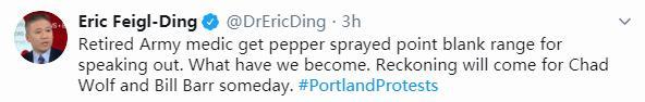 “一个退伍老兵仅仅因为说出了自己的心里话就被胡椒喷雾喷一脸,我们国家成了什么样子。查德·沃尔夫(美国国土安全部代理部长)和比尔·巴尔(美国司法部长)要遭报应。”