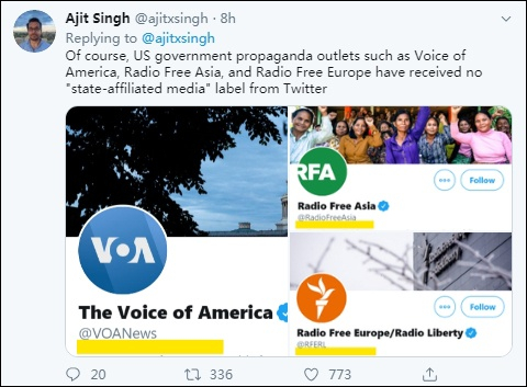 推特只针对中俄媒体账号贴“官媒”标签,网民戳破“双标”