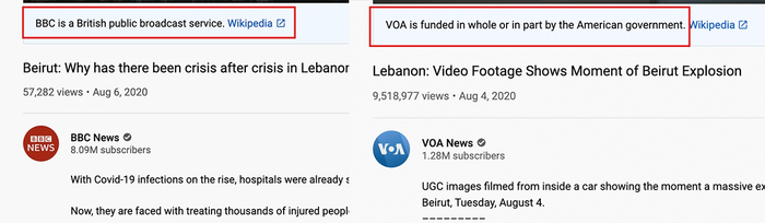 BBC被Youtube标注“英国公共广播机构”,“美国之音”则是“全部或部分受到美国政府资助”