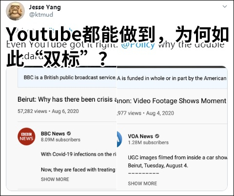 但很快有人贴出“打脸”的事实。不同于推特,美国视频分享网站Youtube在2018年就规定,为增加消息来源的透明度,会对受公共或政府资金资助的视频进行标注,其中就包括BBC与“美国之音”。