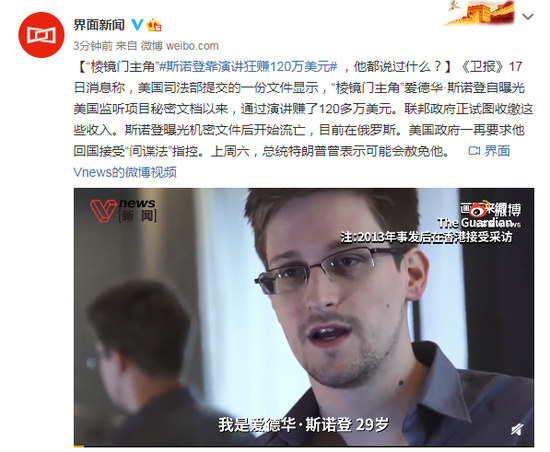 《卫报》17日消息称,美国司法部提交的一份文件显示,“棱镜门主角”爱德华·斯诺登自曝光美国监听项目秘密文档以来,通过演讲赚了120多万美元。联邦政府正试图收缴这些收入。斯诺登曝光机密文件后开始流亡,目前在俄罗斯。美国政府一再要求他回国接受“间谍法”指控。上周六,总统特朗普曾表示可能会赦免他。