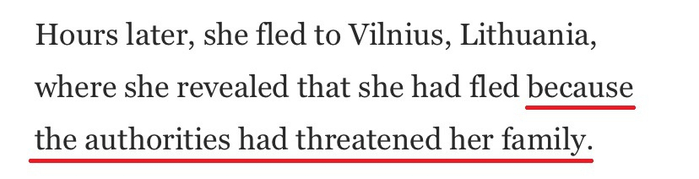 据《华盛顿邮报》报道,季哈诺夫斯卡娅本人称,在选举完成后,她曾经向中央选举委员会就大选结果提出申诉。但迎接她的是7个小时的拘留和录制一段呼吁民众暂停抗议的强制要求。她还称,她逃至立陶宛是因为自己的家人受到了当局的威胁。