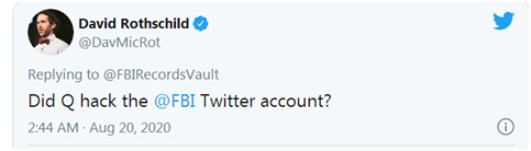 自由经济学家戴维·罗斯柴尔德(David Rothschild)则调侃称:“FBI的推特账户被Q黑了?”文中的“Q”指的正是“匿名者Q”(QAnon)——美国右翼群体中存在的阴谋论。