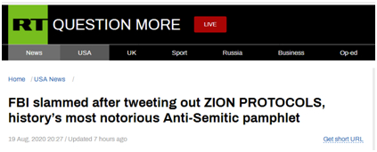 RT介绍称,《锡安长老议定书》是1903年出版的反犹太小册子,旨在描述“犹太人征服世界的规划”,其内容还获得过纳粹德国元首希特勒等反犹太人物的称赞。有资料显示,它还被视为当今几乎所有阴谋论的“鼻祖”。