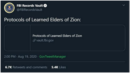 综合“今日俄罗斯”(RT)及英国《卫报》报道,当地时间19日,FBI信息管理部(FBI InformationManagement Division)官方推特发布的一条推文引起网友注意——这条有关《锡安长老议定书》(Protocolsof the Elders of Zion)的推文只列出文件标题和一个PDF链接,并没有其他附加内容。然而多家外媒指出,这是一本有上百年历史、措辞恶毒的反犹太小册子。↓