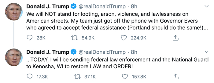 特朗普26日在推特上称,“我们绝不容许美国街道上出现趁乱打劫、纵火、暴力和其他不法行为。我的团队刚和埃弗斯州长通电话,他已同意接受联邦帮助(波特兰也应该如此!)”,“今天,我将派遣联邦执法人员和国民警卫队进入基诺沙,以恢复法律和秩序!”