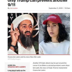 [环球网报道 记者 张晓雅]美国《纽约邮报》5日报道称,“基地”组织前领导人奥萨马·本·拉登的侄女声称,如果乔·拜登当选总统,那么另一场“9·11”恐怖袭击事件可能就在眼前,而只有特朗普连任,才能阻止“9·11”事件再次发生。