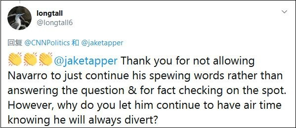 “塔普尔,感谢你不让纳瓦罗继续瞎说下去,而不是让他回答问题,并当场进行事实核查。但是,为什么你明知道他总会转移注意力,还让他上电视呢?”
