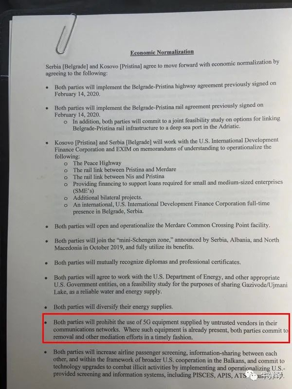 还有,可能涉及中国的部分。因为当时武契奇签字的文本中,有这样一条规定:塞尔维亚和科索沃承诺,禁止使用不受信任的5G供应商产品,如果已经用了,应该及时替换掉。