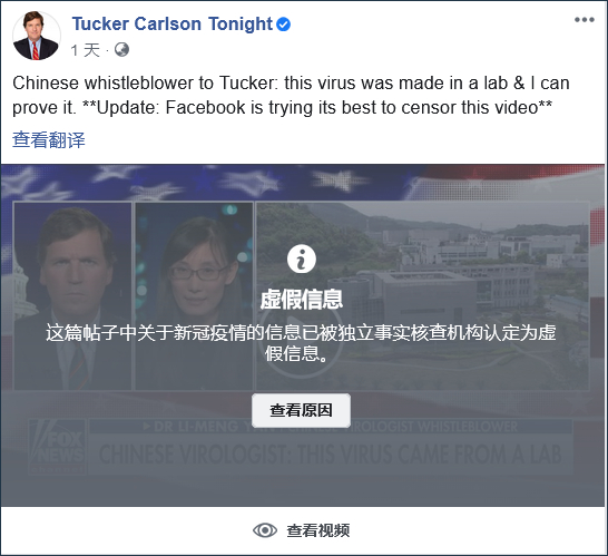 但就在9月16日,脸书及其旗下的照片共享应用“Instagram”,将福克斯新闻节目“塔克·卡尔森今夜秀”(Tucker Carlson Tonight)的帖子标记为“虚假信息”。脸书指出,经该平台多名事实核查人员认定,福克斯新闻节目重复传播的有关新冠病毒的信息“是虚假的”。
