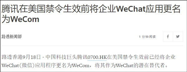 (文/观察者网 一鸣)9月19日消息,路透社报道称,在美国对WeChat(微信)的禁令生效前,腾讯已经把企业WeChat微信应用程序更名为WeCom,将其作为WeChat的潜在替代者。