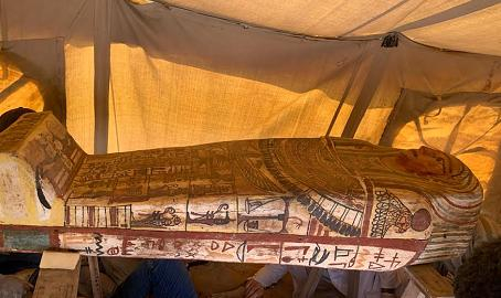 考古工作者上周在同一地点出土了13具木棺,19日又再出土了14具,此外还出土了一些小型雕像和其他手工制品。图片显示这些木棺保存完好,表面绘有精美人像。声明说:“初步研究显示,这些棺材自埋葬之日起就从未打开。”