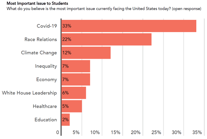 调查同时显示,33%的大学生受访者认为,应对新冠疫情是他们最关心的问题,种族关系和气候变化分列二三位。而这三个大学生最关心的问题,恰恰都是特朗普和共和党的软肋,令他们今年更难获得大学生的支持。