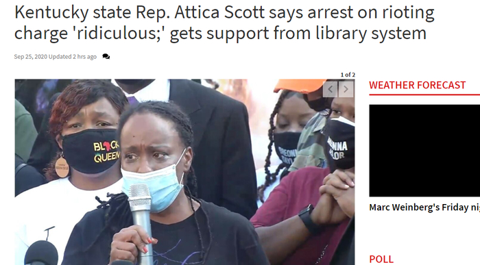 《华盛顿邮报》引述肯塔基州当地媒体的说法称,斯科特以及20多名在抗议者是在周四晚被逮捕的。当时她和她所在抗议者群体被指涉嫌在当地一处公共图书馆附近纵火,因此被警方以“一级暴动”这项重罪,以及“非法集会”、“未能按警方要求散去”等两项轻罪而逮捕。