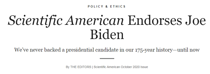 今年9月,著名科普杂志《科学美国人》宣布支持前副总统、民主党总统候选人拜登,谴责特朗普“无视科学”。这也是该杂志在其175年历史上第一次公开表示支持某位总统候选人。