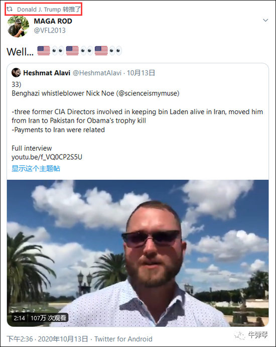 比如,特朗普转发的第一条,是来自一个名为QAnon阴谋论组织的关联账号。