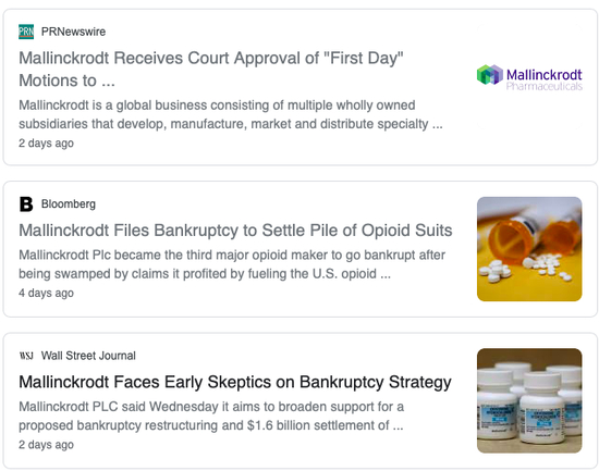 除了巨额债务,其身上沉重的诉讼压力导致其不得不走破产保护程序。自三年前总统特朗普在全国发起“结束美国阿片危机”的号召后,地方政府以及民间人士发起了数千起针对阿片类药物相关方的诉讼,仅Mallinckrodt一家公司卷入的相关官司数量就近3000起。