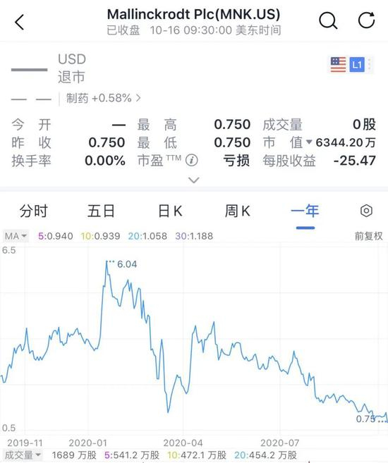 由于这一系列问题,Mallinckrodt的股价从今年高点6.04美元一路下滑,跌幅超87%,今年10月10日公司退市。