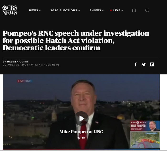 蓬佩奥“出现”在大会上之后,《纽约邮报》报道称,蓬佩奥成为75年来首位在全国性政党代表大会上发言的国务卿。根据美国1939年颁布的《哈奇法案》,除总统和副总统以外,联邦政府官员禁止在执行公务时参加政治活动。尽管美国国务院保证,蓬佩奥以“个人身份”发言不会违反《哈奇法案》,但正在执行公务的他要在大会上发表演讲,还是被媒体指责不仅影响外交工作,还涉嫌违法。