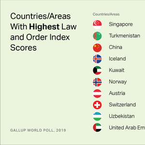 在盖洛普发布的这份最新榜单中,新加坡和土库曼斯坦以97分位列前两名,中国位列第三。排名的前十的国家还有冰岛、科威特、挪威、奥地利、瑞士、乌兹别克斯坦和阿联酋,这些国家的分数都在90分之上。在这一排名中,阿富汗的分数最低,仅为43分。统计数据显示,2019年,全球法律与秩序指数的平均分为82分,与上一年基本持平,但在144个接受调查的国家和地区中,有90个分数低于平均值。