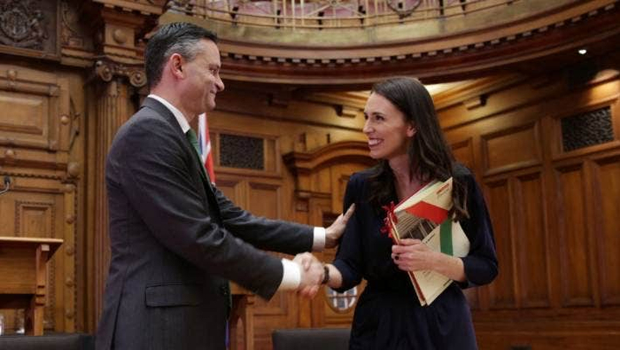 当地时间11月1日,新西兰工党领袖杰辛达·阿德恩和两位绿党联合领导人正式签署了组建新政府的协议。阿德恩连任新西兰总理,绿党两位领导人也将出任新政府的部长。10月17日,新西兰工党在大选中赢得120个国会议席中的64个议席,取得压倒性胜利,原本可以单独执政,但是工党选择了与绿党组建联合政府。(总台记者 林清辉)