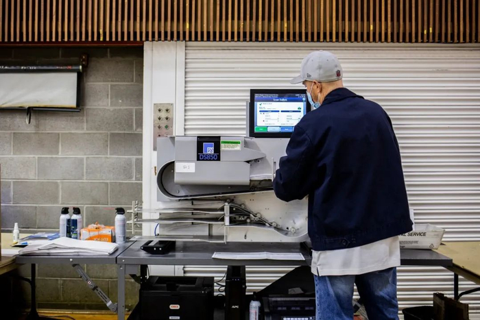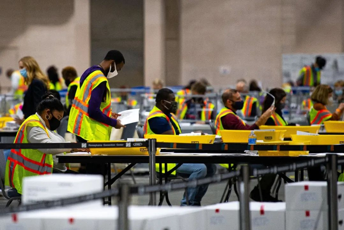 宾夕法尼亚费城,选举专员办公室的选举工作者在会议中心将选票进行分类。©Kriston Jae Bethel